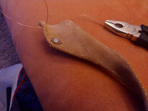 Aus passenden Lederrückständen habe ich zwei gleiche Stücke geschnitten. ... Gesaumt de rundherum Diese hebe ich mit Kupferdraht. Sieht aus frescos, aber Achtung, Leder zu nähen braucht Nerven, und das dazu noch mit Draht... phuuu. Nadel musste mit der Flachzange durchgestossen werden. Diese Lederstücke wurden dann un angenäht der Brille. Hinten habe ich Druckknöpfe montiert.