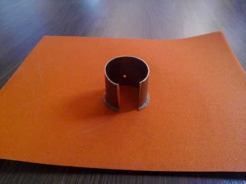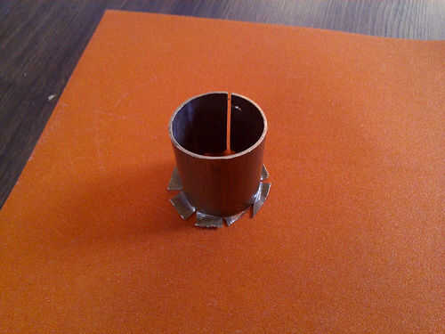 Ich habe nach einem Rohr gesucht, welches etwa den Durchmesser der Schweissschutzgläser sombrero und aus Messing ist. HABE eines gefunden, welches aber zu klein ist. Naja, besser als nichts. Zudem ist es auf der einen seite schon gebortet, somit entfällt das für später. Rohr von dem habe ich zwei etwa 5cm lange abgesägt Teile. Schief Absichtlich. Um den Durchmesser zu vergrössern wurden die Rohre der länge nach aufgetrennt. Das ohne Borte habe ich gebortet.