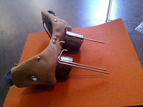 aquí es algo rápido y barato lanzó para una Convención steampunk. Se hace de trozos de piel artificial, un viejo cinturón de buena voluntad y un par de latas de almacenamiento imán con un poco de pintura en aerosol y pegamento caliente.No tengo fotos