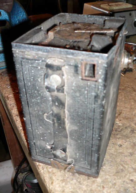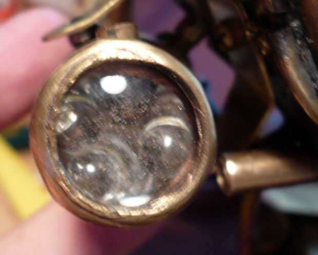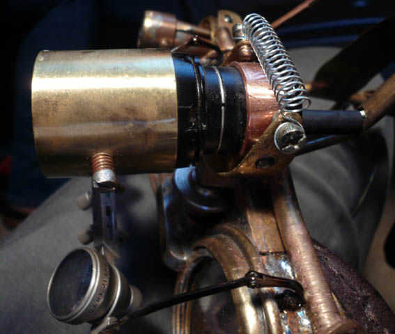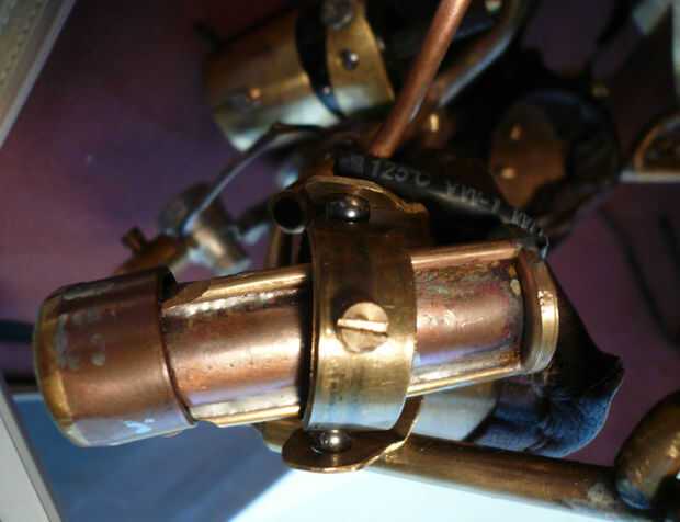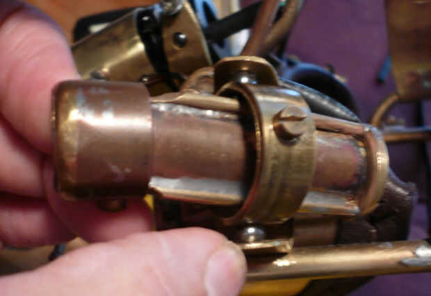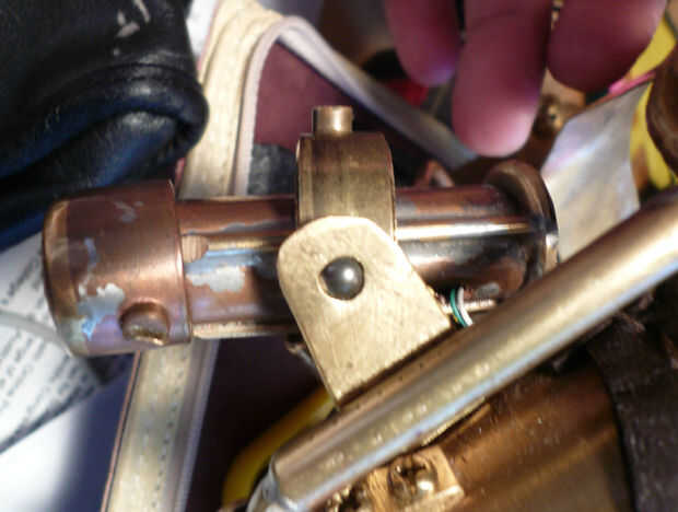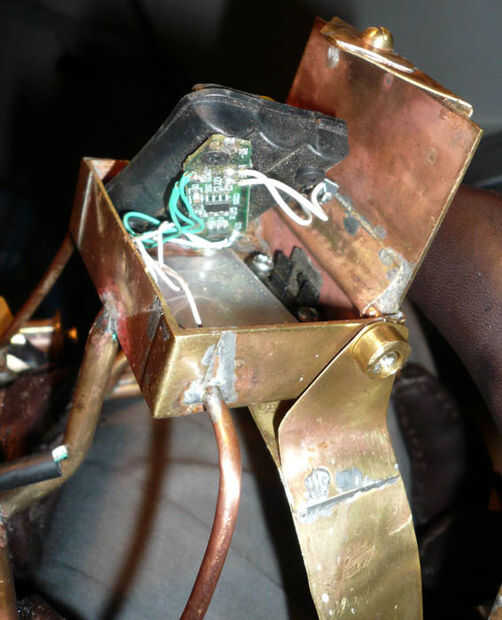 Las lentes de las luces pilotas fueron recicladas de una vieja cámara de Brownie caja que conseguí por $2.00 en el desguace. Montado en un sobrante de tubo de latón que tenía que sólo cubra el tubo de cobre en la que se montaron los LEDs. Reducido del final de la tubería de cobre por calentamiento y martilleo sobre una barra sólida anterior. Esto permitió que el back-end pasar el tubo de cobre mientras no permite que las lentes, que eran del mismo diámetro que la identificación de la tubería de cobre, para permanecer en el lugar sin caer fuera de la tubería. Luego se enrosque el tubo de latón en el eje de la tubería de cobre con un tornillo transversal. Luego se montaron las luces laterales terminadas en un círculo de bronce, corte de una tubería de cobre. tornillos fijan el punto medio del círculo de latón para el punto medio del eje o el cañón de la luz, que permiten movimiento alrededor de este punto central. El círculo de latón entonces se monta en un soporte de rodamiento enchufables.