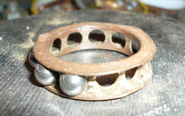 Cada una de las tres luces se puede mover alrededor de un eje a través de una gama de aproximadamente 45 º. en todas las direcciones, con un montaje de rodamientos de bolas. Los titulares se hacen crom bronce hoja, doblada en una forma de c y tener agujeros perforados en los extremos de las "armas" para tomar un rodamiento de bolas. similares agujeros en el cañón de eje de cada luz permite un agarre de fricción de los rodamientos de bolas entre los brazos y el cañón de hueco de luz. Si los brazos del soporte en forma de C están demasiado lejos aparte, la bola no se sostiene bastante bien y la luz no mantendrá su posición deseada. Si los brazos están demasiado juntos, es difícil conseguir las bolas a su posición. He encontrado que este diseño ha trabajado mejor con recocido no metal para los titulares C-arm. Las bolas sólo se cosecharon de un cojinete de bola-raza antiguo encontrado en el desguace.