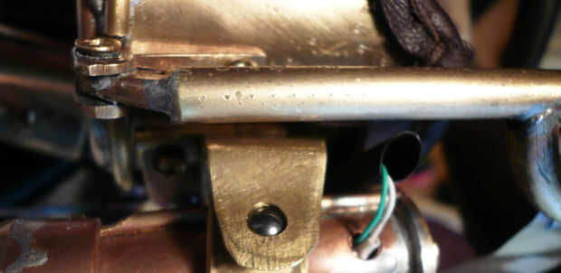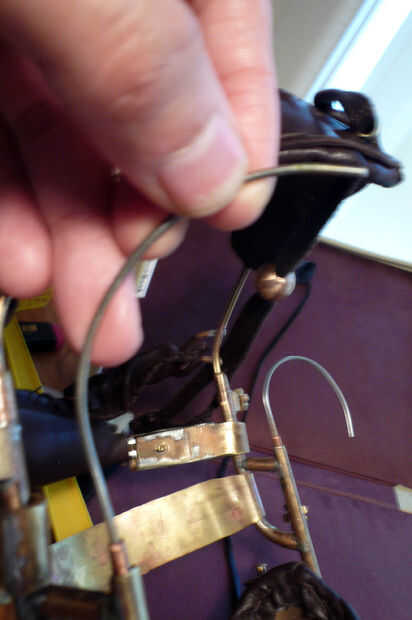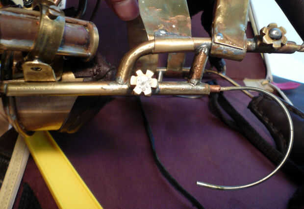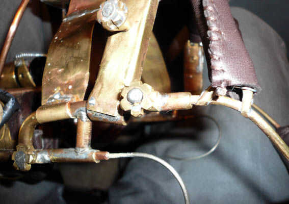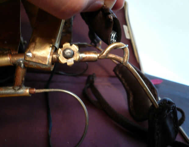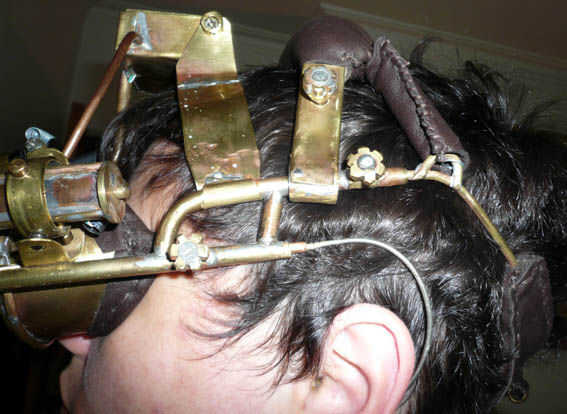 Como un par de gafas requiere auriculares para situar las lentes correctamente, el dispositivo reforzador de la visión utiliza la misma idea. Los brazos de los auriculares se unen a las tapas de soporte de las lentes oculares por bisagras de cobre amarillo que fueron hechas de recortes de varilla de latón y luego en forma de ayuda de un cortametales angular y archivos a mano. Los tallos fueron hechos de tubo de latón hueco que podría llevar telescópico flexibles ganchos de oreja (picados de un pedazo redundante de desgaste del ojo). Las almohadillas de presión detrás de la cabeza, por el lazo, también se les permitiera telescopio en el cañón superior de los brazos del auricular. La posición final del tallo en el barril fue fijada por un tornillo de bloqueo. Este sistema permitida para algunos ajustes de tamaño entre diferentes usuarios. La parte delantera del cañón se formó en una bisagra de chenillé una varilla de latón corto, esto en lugar de soldadura y pulido y perforación esto apropiadamente a mate con lo otros hing componentes atornillan al lado de las tapas de soporte de las lentes oculares. Se lleva el peso principal en el soporte vertical acolchada de cuero funcionando por encima de la cabeza y esto se une a la parte del tubo auricular superior, como es la correa de longitud fija lleva la caja de la batería.