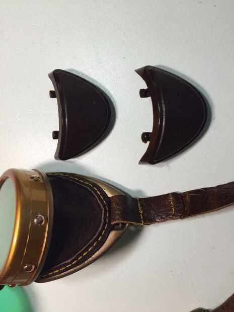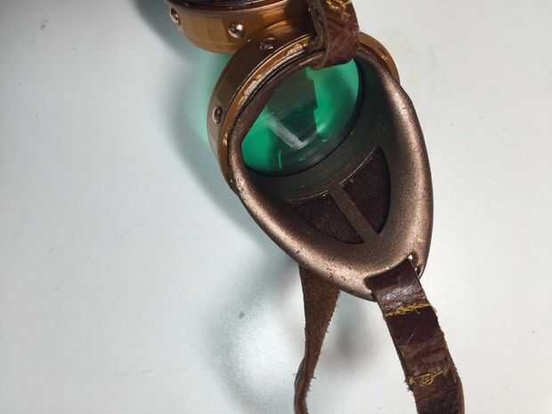 7. después de gafas pintado piezas estén secas y pegar las tapas de soporte es seco, antigüedad de las piezas. Usando el pincel de espuma y pintura de esmalte negro, ligeramente lenguado piezas con pintura negra y rápidamente limpiar con toallas de papel o un trapo suave, permitiendo que algunos de la pintura negra para permanecer en las grietas y en los detalles de brad/remache. (Sé que las fotos muestran que envejecido la pieza después he añadido las tiras de cuero, pero es realmente mejor hacer esto antes.)
