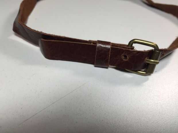 10. para las correas puede utilizar una correa vieja si tienes uno que se ajuste. Si usted desea hacer su propia correa como hice yo, use el cuero más grueso y la hebilla de un cinturón viejo. Cortar dos tiras de cuero 1/2" de ancho por 10" a 12" de largo. Por el lado de la hebilla de la correa, doblar un extremo hacia abajo 1 1/4" y cortar una pequeña muesca de la tapa de la punta de la hebilla (mirar uno de sus cinturones para ver cómo se colocan juntos). Para el bucle de la correa, me corte una pieza de 3/8" de ancho por 1 1/2" de largo y que había pegado debajo de la correa. Había insertada la hebilla y dobla el extremo a la parte posterior, sobre los extremos pegados del lazo y luego cosidas a los extremos a cada lado del lazo. Si no tienes una máquina de coser, puede coser a mano o fijar con remaches.