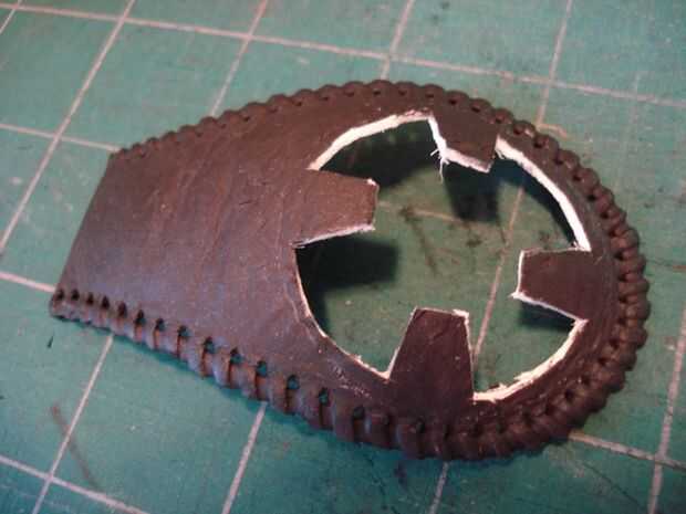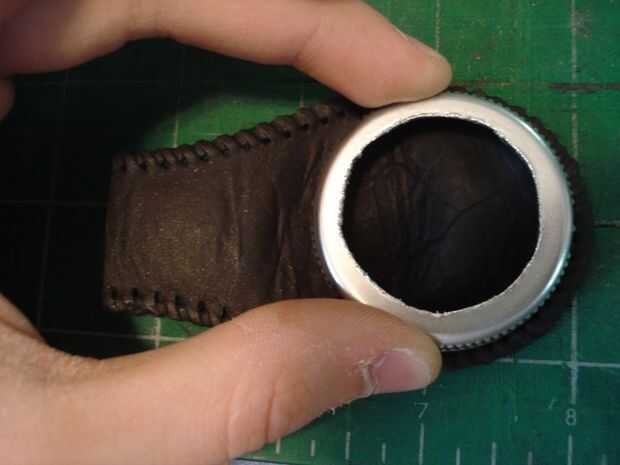 Una vez todo seco, tomar un ocular y se alinean en el bombeo de una de las piezas de cuero. Tome un lápiz o algo que puede marcar la piel pintada y rastrear el interior círculo del ocular en el cuero. Ahora, toma el cuchillo y cortar ese círculo dejando cuatro pestañas. Estas fichas se utilizarán para garantizar el cuero en el ocular. Asegúrese de guardar el recorte en una sola pieza! Usará uno de los recortes más tarde para la visera del yelmo.