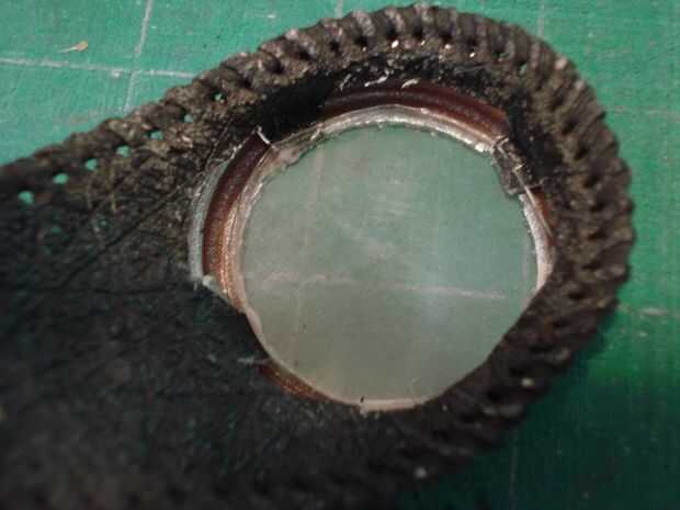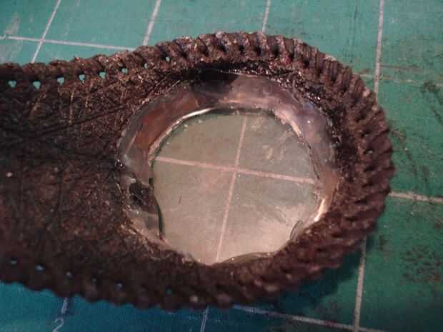 Una vez que las fichas de los oculares terminaron de secar, colocar la lente en el ocular, asegúrese de que los bordes todos se superponen, luego aplicarán pegamento alrededor del borde para asegurarlo. Mientras estás en ello, también reforzar las pestañas con pegamento caliente. Asegúrese de que el pegamento no va más allá del borde del ocular, o lo verás a través de la lente!