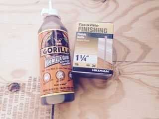 Uñas: utilicé sólo lo que sostendría la madera hasta que el pegamento gorila secado y pasó a ser 1 1/4 en acabado de uñas
