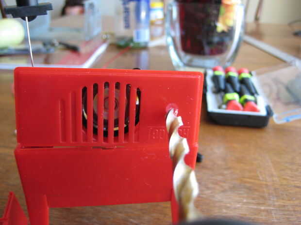 Perfore un orificio de 1/4" en la parte posterior el theremin justo a la derecha del altavoz. Esto será para el montaje de audio jack de salida. Encontré que sujetan el panel en el lugar donde debe serme ayudó a hacer en blanco. Debe hacer esto. Siempre cosas de la abrazadera hacia abajo y ser seguro cuando se trabaja con herramientas eléctricas.