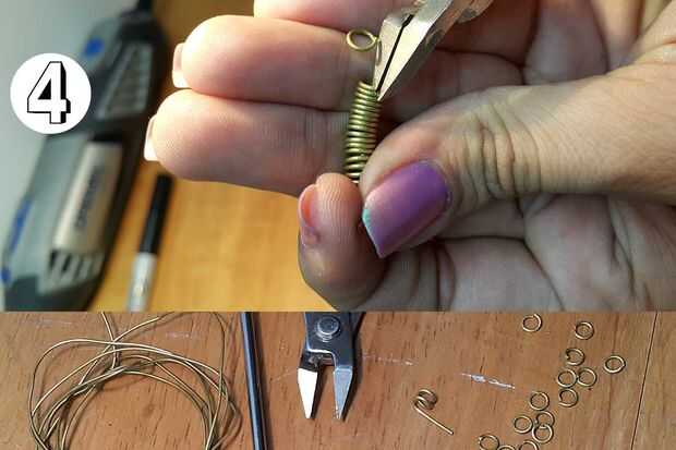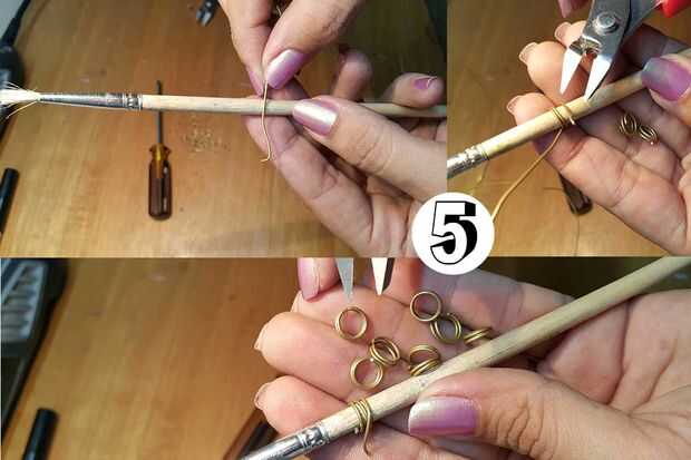 5. para hacer los anillos (B) utilizar una herramienta con un gran diámetro (en mi caso, utilicé un pincel) que sean más gruesas que el anillo (A). Siga los mismos pasos envolviendo el alambre alrededor del cepillo de la pintura, quitando el pincel, y cortar los anillos. Sin embargo, éstos quedan doble. En otras palabras, cortar un alambre y dejar uno sin cortar (intercalando) para hacerlos dobles. (ver video)