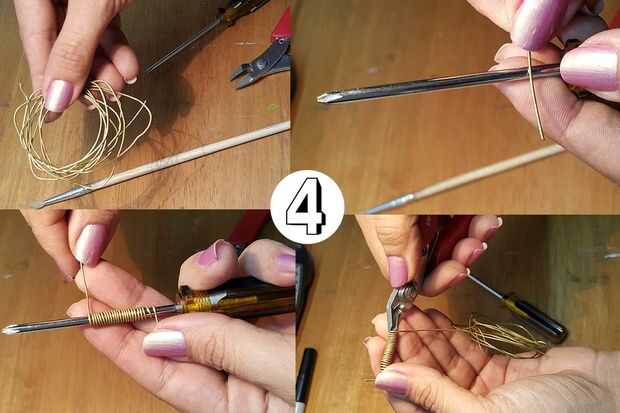 4. encontrar cualquier herramienta cilíndrica con el diámetro deseado. Esto le dará el diámetro de los anillos (A) en mi caso, utilicé un destornillador. El alambre de cobre se envuelve alrededor de la srewdriver. Asegúrese de girar el alambre de cobre alrededor de él tantas veces como puedas, para que crear los anillos necesarios. A continuación, extraiga el rollo. Con unos alicates, corte cada uno de los anillos siguiendo el mismo corte de líneas. Y, tenemos los anillos! (A).
