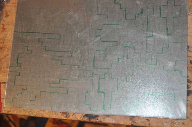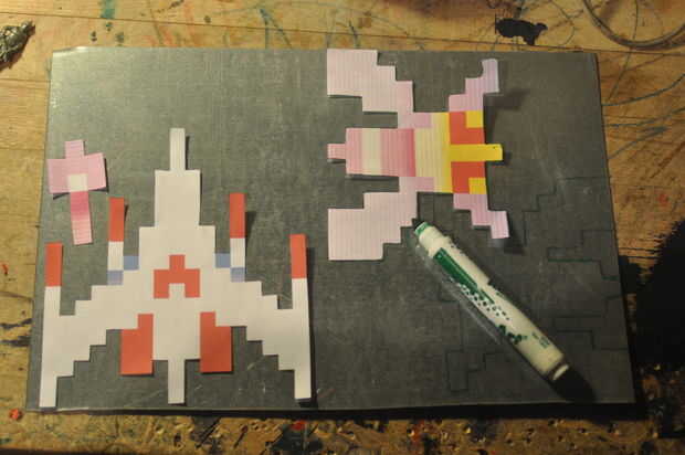 Utilizar el pdf para hacer las plantillas. Todo lo que necesitas hacer es imprimirlo. Luego, puedes acceder a sus habilidades de corte de jardín de infantes para recortar su plantilla. Trate de hacer un buen trabajo de corte porque entonces sus piezas metálicas serán más exactos. Una vez que las plantillas, dibujarlos hacia fuera en su pieza del marcador mágico handy hyour de ingenio metal de hoja. Marcadores mágicos son buenos porque se puede limpiar apagado fácilmente. Fui capaz de encajar dos naves alienígenas, un "buen tipo" nave y tres dardos. Podrían caber más dardos, pero realmente no me sentía como él.