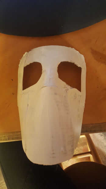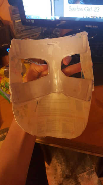 En primer lugar, debe crear la base de la máscara. La máscara es un rostro completo, pero la noseguard sólo cubre alrededor de la mitad para tuvo que hacerlo por lo que tuvo más cobertura. Lo hice cortando el cubo del plástico del yogur en tres secciones separadas, entonces hotglued a la máscara y otra. Luego apliqué una capa delgada de papermache al frente de la máscara que incluso hacia fuera cuando llegó el momento de pintar. Por último apliqué una capa base de pintura blanca.