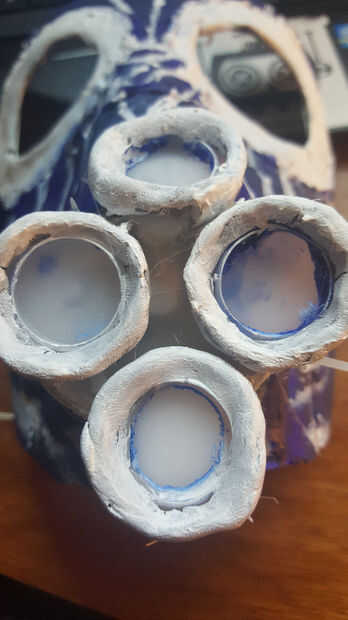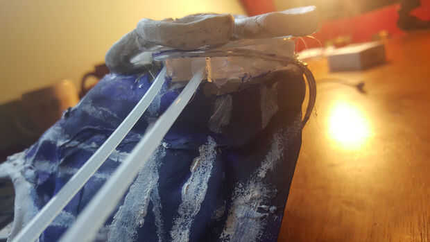 Una vez hecho esto, usted puede pegar en un patrón de 1/2/1 (véase el cuadro) en el árbol de plástico. Pegué la tapa de la botella superior a medio camino entre el árbol y el resto del hocico de arcilla por lo que parecía una transición más limpia entre el hocico y la electrónica. Hacer esto con el árbol conectado a la computadora que se enciende y puede asegurarse de que las tapas son y se ven bien en los LEDs.