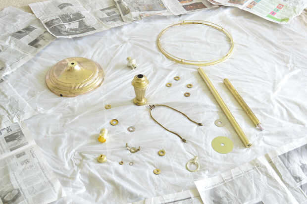 Cada vez que haces un cambio de imagen que tiene un montón de montaje, tome algunos cierre encima de tiros de cómo las partes se reunieron antes que desarmarlos. Será mucho más fácil cuando se vuelva a montar. Como primer paso, desmontar la lámpara entera y me puso las piezas de metal en una lona lista para la pintura a pistola.