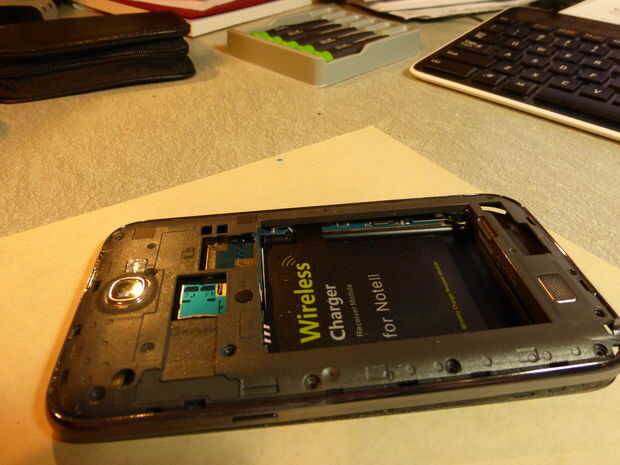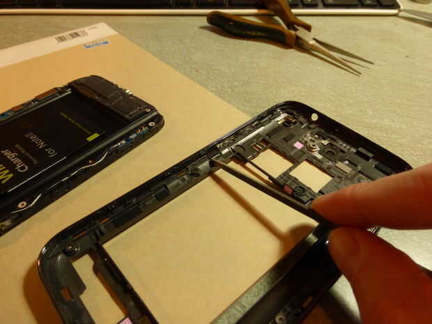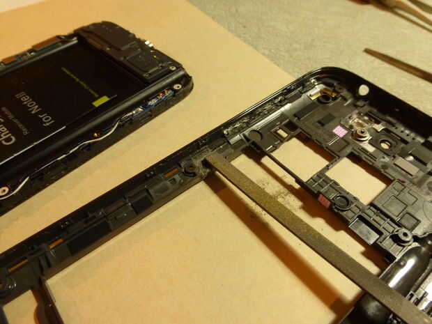Presentar ahora un surco en el interior borde de la parte posterior del caso para hacer una ranura para el conector de pasar a través de los contactos. Probar el ajuste a medida que avanza. Estoy seguro que podría acelerar este proceso con una herramienta eléctrica o dos, pero yo estaba nervioso acerca de daños en el caso, así que lo hice la manera lenta y cuidadosa, con par de archivos de la aguja.