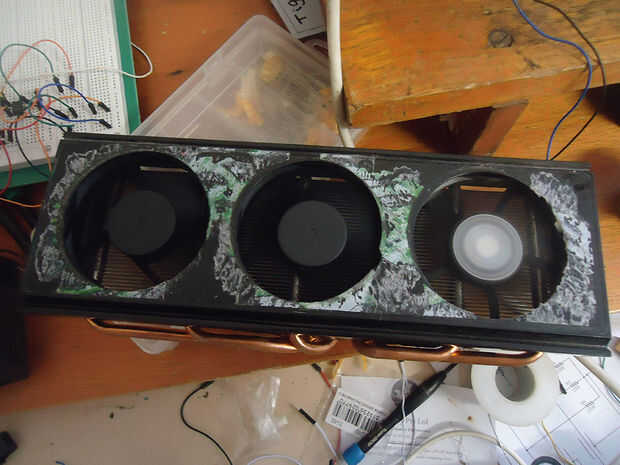 Para asegurarse de que todo está funcionando, enciende los ventiladores otra vez, asegurándose de que todo funciona. Tuve un pequeño problema con uno de los cables en uno de los ventiladores, que se fija fácilmente empujándolo hacia atrás en su lugar.