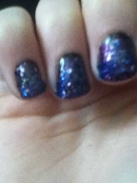 Hágalo usted mismo galaxy nails! Esta forma es bastante fácil y sólo me tomó unos veinte minutos. ¡Buena suerte!Paso 1: Paso 1: materialesMateriales que necesitará:-Púrpura, azul, blanco y negro esmalte de uñas (para la mina, utilicé colores pecamino