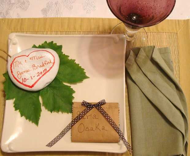 Este instructable es continuación de la galería de boda parte 1 DIY. En este instructable compartiré tarjetas del lugar, pedazos de centro y hallazgos de la naturaleza. En esta foto utilicé una hoja de uva, un favor de boda paquetes de semillas y una roca pintada con la novia y del novio nombre y fecha de boda.  Puede usar cualquier hoja verde o seca la hoja pulsando entre las páginas del libro. También puede encontrar un patrón de hojas de uva en línea haciendo un pre escolar para colorear búsqueda de página del libro y la impresión hacia fuera.