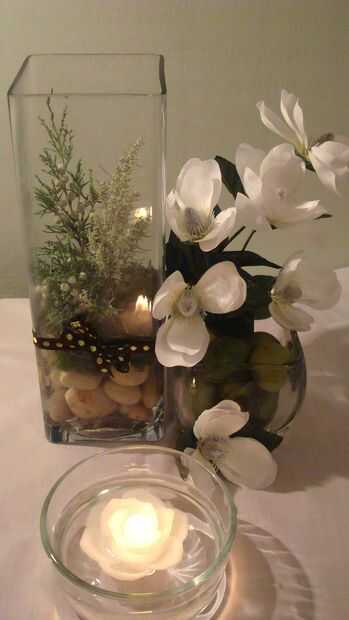Aquí puse pequeñas rocas en floreros, flores agregados, agua, un tronco de enebro, cinta, maleza silvestre que encontré en el país, y una flotación de la vela para establecer el tono. Esto podría utilizarse para la mesa en la entrada de la ceremonia de la boda. Vidrio claro es elegante, romántica y elegante para cualquier ocasión formal.