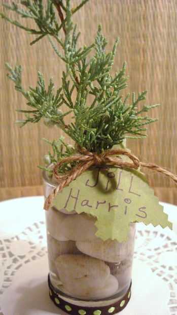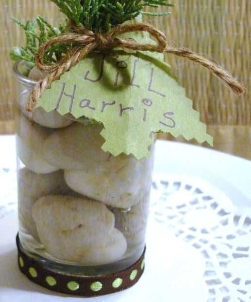 Esto fue hecho para un portatarjetas del lugar pero se podría utilizar para una decoración de la mesa por no hacer la etiqueta de nombre.   He añadido rocas del río, agua, un tronco de enebro, un árbol picado sobre papel stock tarjeta verde con un lazo de yute y una cinta.  Es sobre una servilleta de papel y un plato blanco.