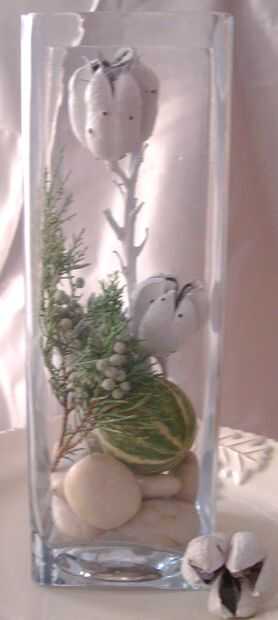 Aquí coloqué la roca en el fondo de un jarrón transparente cuadrado alto y añade una bolsita de yuca pintada, tallo perenne, una calabaza y colocarla en una placa de "blanco".   Esto hace un arreglo de invierno muy agradable.  Podría agregar algodón en lugar de la roca para hacer un arreglo de nieve.  Pensé que podría ser bastante con unos frutos rojos.  Hay muchas maneras que usted puede crear un arreglo.