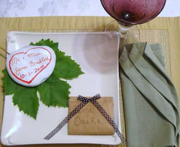 Aquí es una roca del río pintado. Sr. & Sra. Bradford y su fecha de boda con un marcador. Matchbook de una bolsa de papel doblado como un matchbook, grapada y una cinta de añadido. Alberga las semillas de árbol brote rojo y una nota personal de la feliz pareja. Se sienta en un plato cuadrado blanco con una hoja de uva debajo de él.