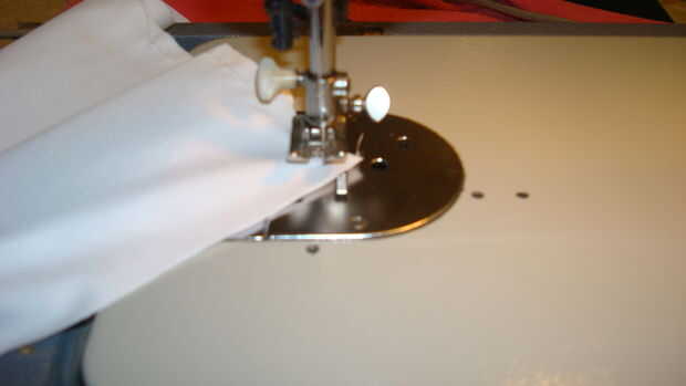 6. coser todo el camino alrededor del principio de la servilleta en la marca media de la servilleta.  Ver fotos de cómo girar las esquinas para hacer un bonito rincón.  Continuar cosiendo alrededor de 3 lados. En el cuarto lado recuerda que parar en la marca de detención.