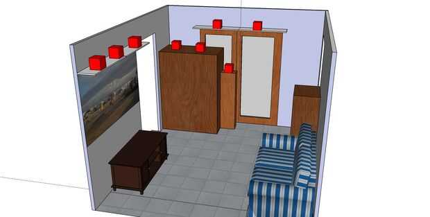Este paso es auto explicativo, sin embargo determina algunas cosas acerca de cómo continuar. Hay varias maneras que usted puede planear su diseño. Lo principal es decidir Cuántos objetivos desea, y lo hará los objetivos. Acciones de posible objetivo a tener en cuenta se podría mover un servo, luz, activar un relé, etc.. Tan obtener detallados y usar Google Sketchup, o tomar unas copas y dibujar en una servilleta. Depende de usted. He decidido empezar con un render de Sketchup. Primer modelo de la zona que se utilizará. Luego añadí cubos rojos para visualizar la ubicación de destino.