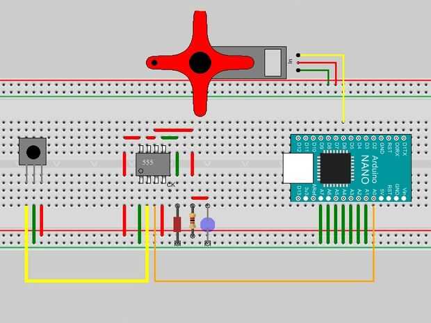 Descubrí que si se intenta usar este código completo con un único sensor de actualización / servo, tiene todos los pines analógicos conectar a tierra. El gráfico muestra también mi actual configuración protoboard con un Arduino Nano. Demuestra que sólo un sensor IR y un servo.