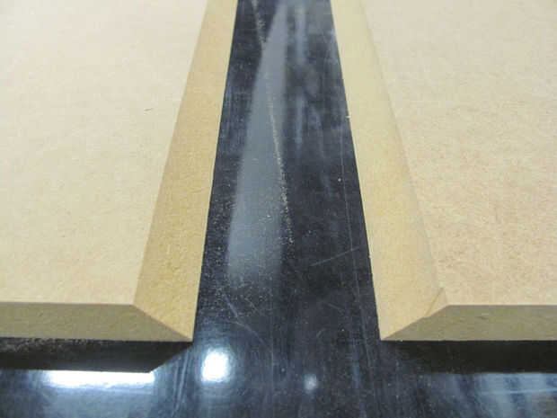 En este caso, corté un cuadrado de 6 "x 6" en la Sierra de mesa. Luego corté por la mitad para hacer las tapas para el pedestal de la pared. Después de eso, entonces corté un rectángulo de 7 1/8 "x 16" para definir la superficie superior del pedestal. El soporte inferior se cortó a 8 13/16 "x 16. Ajustar estas mediciones para cualquier tamaño de pedestal que están haciendo. La superficie tendrá una ingletes a 45 grados, mientras que la cara inferior tendrá ambos bordes inglete a 45 grados.