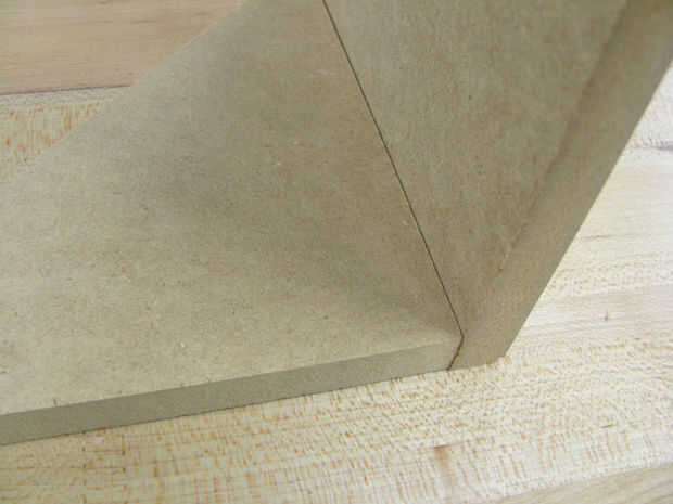 Ahora es el momento de montar las piezas una vez se han cortado al tamaño y los bordes inglete. Empezar por la superficie superior (pieza con borde un 45 grados) en el extremo, de pie colocando el triángulo al ras con el borde plano.