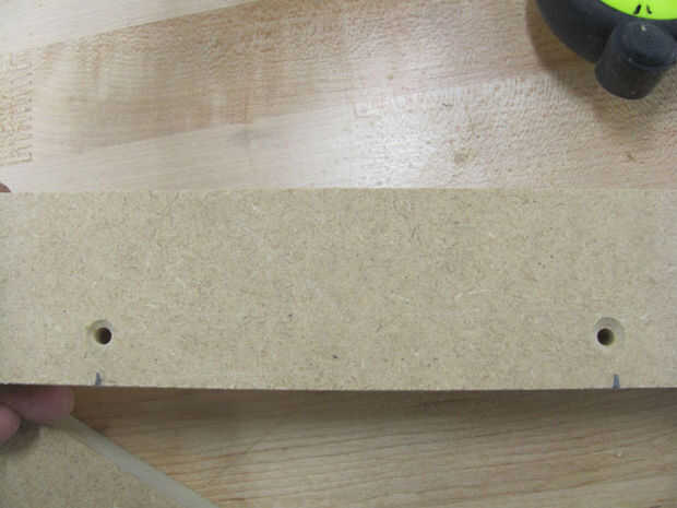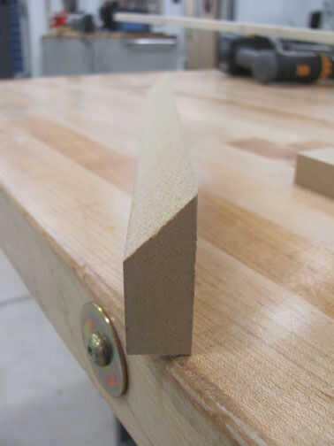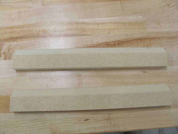 Ahora, usted necesita cortar dos piezas de MDF de 2 "x 14" con un inglete 45 de grados en cada uno, para hacer la cuña que colgaré el pedestal. Después de cortar el inglete, generalmente taladre y avellane al menos 3 agujeros para colocar la Cala en la pared. Usando una grapa francesa, el pedestal se puede instalarse fácilmente sin cualquier conectores que muestra desde la parte delantera.