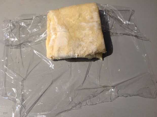 Agregue el agua. No se esperaba una masa. Si consigues una masa está bien pero si es demasiado pegajosa añadir un poco de harina. Rollo como se muestra. Envuelva envoltura de plástico y refrigere durante 2 horas.