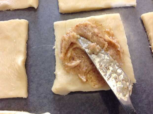 Poner la masa en pan de ghetto y extender la crema de almendra.