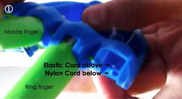 1. La 01.Palm.STL pieza tiene 2 agujeros para cada dedo que corresponden a los dos cables. El agujero para la cuerda elástica es superior y el agujero para la cuerda de nylon es abajo. Empezar a introducir el cordón elástico y nylon de los dedos "Ring" y "Medios".