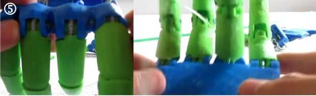4. Luego derretir el filamento en el centro de ambos dedos para garantizar totalmente el dedo con que está trabajando. Repita el proceso de filamento para asegurar la articulación de los otros dedos. Repita todo el procedimiento con el meñique y el dedo índice: introducir el cordón elástico y nylon en los agujeros correspondientes 01.Palm.STLs y colocar el filamento que une el empalme de fusión los bordes).