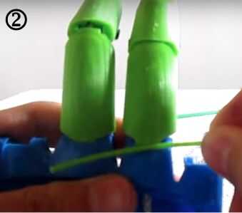 2. Cortar un trozo del filamento más ancho que la distancia de dos dedos ("Anillo" y "Medios"). Introducir el filamento por el lado del "Dedo de anillo" por ambos dedos para conectarlos a la articulación de la palma.