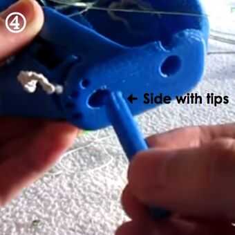 5. Fijar la tensión del pulgar tirando del cordón elástico y nylon. Cuando se tiene la tensión correcta hacer un nudo en la cuerda elástica. Cortar el exceso de la cuerda elástica.