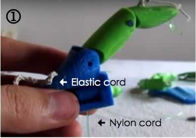 1. Introducir el cordón elástico en el orificio de la parte que conecta la falange proximal a través de la 03.Thumb_Palm_Mechanism.STL (la cuerda elástica tiene que salir del agujero a la izquierda de la barra deslizante). Introducir la cuerda de nylon en el otro orificio (el hilo de nylon tiene que salir a la derecha del control deslizante).