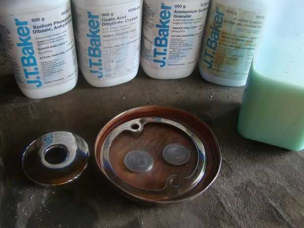 El recipiente de hierro/acero debe ser lavado y desgrasado, las piezas que debe lavar y desengrasar demasiado cobre plateado, utilizo detergente básico.