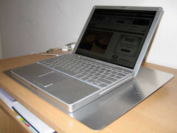 hacer un portátil de refrigeración pasivo de una bandeja de galletas. Esta idea fue inspirada por KoolSink portátil soportes y su precio ridículamente caro. El resultado no es tan pulido pero apuesto a funciona igual de bien y cuesta mucho menos.