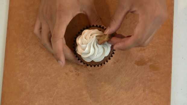Usando una manga pastelera con una punta de estrella grande, tubo un gran montículo espiral en cada cupcake (sólo la tubería cerca de la mitad tanto como lo hice en el video/fotos. Yo doble la receta de crema de mantequilla para mi video para conseguir grandes montículos, sino crea demasiado dulces cupcakes). A continuación, cortar sus galletas por la mitad y colocar una cookie la mitad sobre cada cupcake.