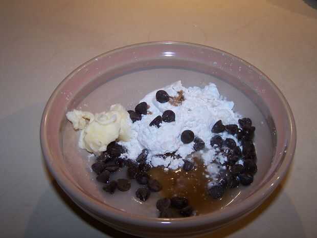 Hacer un montón de cosas en tazas. Como esto!Paso 1: ingredientesAzúcar, panela, harina, sal, mantequilla, vainilla, aceite, huevos, trocitos de chocolate.Paso 2: medida1 cucharada de mantequilla, 1 cucharada azúcar, 1 cucharada de azúcar morena, spl