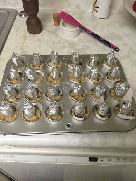 Rociar la sartén con aerosol de cocina antiadherente y colocar tiras de papel de pergamino en cada toma. Este pergamino será un dispositivo de elevación para sacar el vaso de chupito con seguridad de la bandeja.