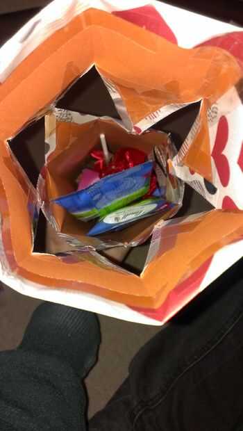 Luego rellenar con las golosinas que está dando como un regalo y ata la otra cinta en el extremo abierto.