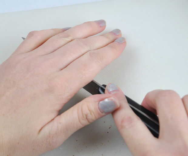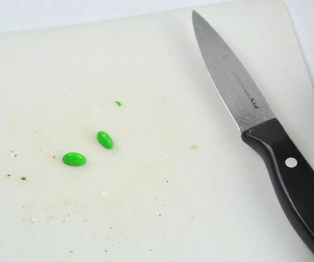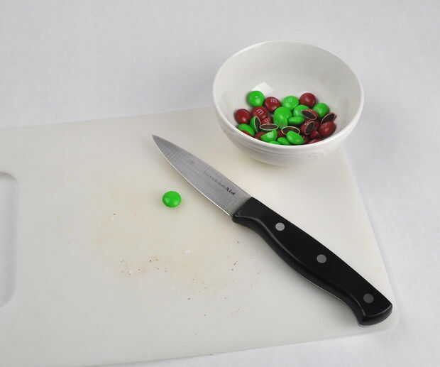 - Con la otra mano, cubrir la parte superior de la cuchilla manteniendo los dedos lejos de la lámina. Esta mano es para contener los M & M cuando se corte, de lo contrario vuela a través de la habitación.