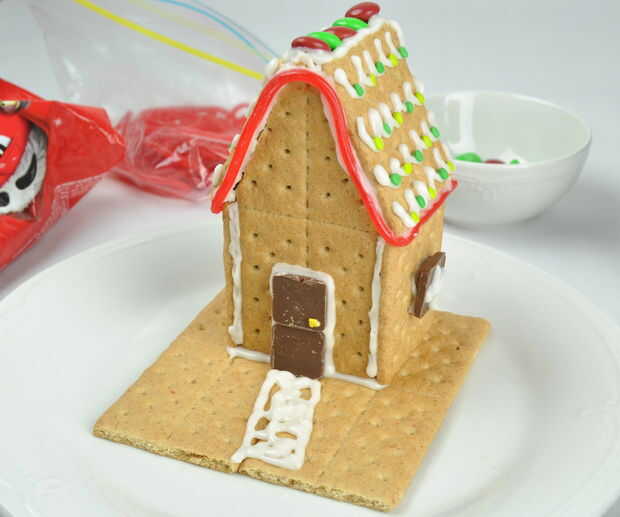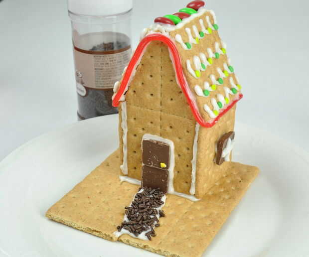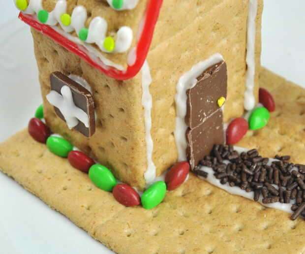 Adorno de la casa. Pensé en la parte inferior de la casa necesita más, y quería cubrir el glaseado extra que se utiliza para pegar a la base. Así que corté M & Ms a la mitad. TENGA muy cuidado si lo haces de la manera que lo hizo.