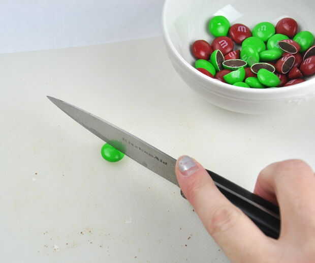 - Con la mano dominante, establecer el cuchillo en el M & M donde desea cortar.