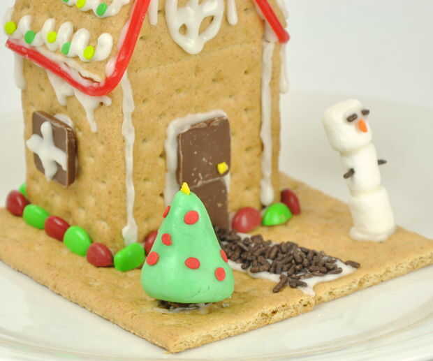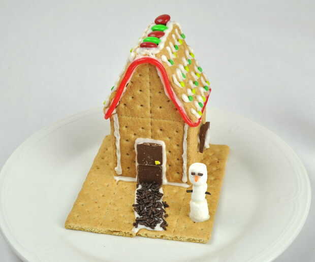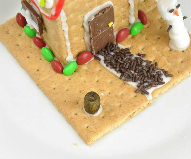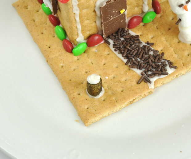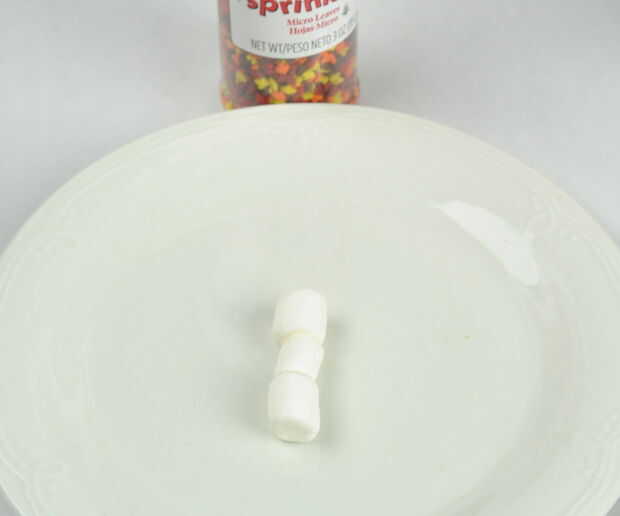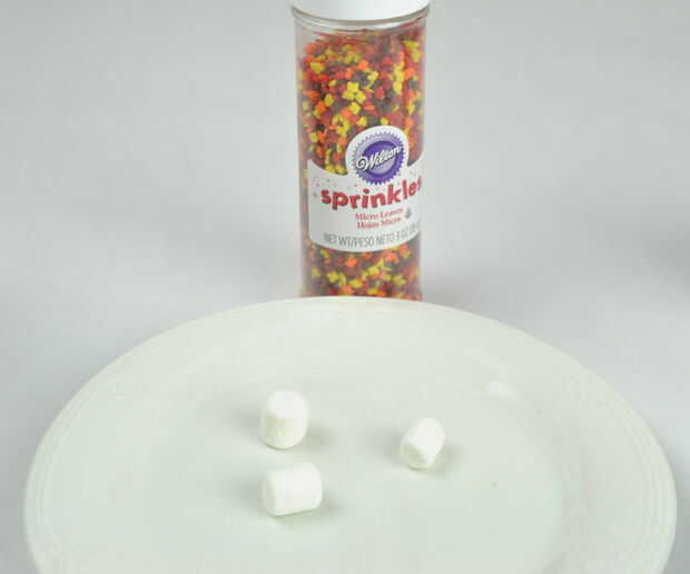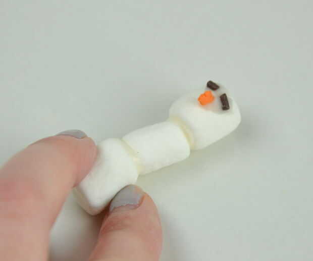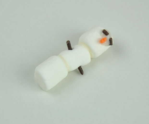 Muñeco de nieve. Tomar tres malvaviscos mini, una hoja de naranja de la caída hojas chispitas y barretas marrón 4. Conecte las melcochas con glaseado. Coloque una barreta para cada ojo y la hoja para la nariz. Tome un palillo de dientes y una puñalada en los lados de la melcocha de centro. Meter en el dos barretas marrón más largas que puede encontrar. Le pegue en la base de la formación de hielo. Asegúrese de que no caiga!