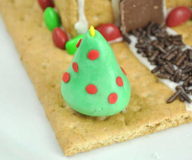 Árbol. Decidí usar mi fondant sobrante para esto. Podría utilizar un Bugle cubierto de glaseado blanco o verde, un trozo de maíz de caramelo con glaseado o incluso aquellas piezas triángulo de galleta que corte la formación de hielo sobre ellos. Primero tomó algunos mini malvaviscos y había cubierto en colorante. Usé glaseado para unir esto a la base como el tronco del árbol. (Es difícil equilibrar el árbol en la cepa, por lo que no es realmente necesario). Tomar un trozo de buen tamaño (fondant) y rollo en su mano para hacerla cilíndrica pero mentón en uno de los extremos. Sostenga con una mano y aplastar en su otra Palma para que sea más como un árbol. Cuando esté listo, utilice hielo para sujetar a la base y smash abajo el malvavisco, de lo contrario podría tratar de caer. Decoré mi árbol pero solo pegarse en algún círculo rojo rociado y pone una pizca de hoja amarilla en la parte superior.